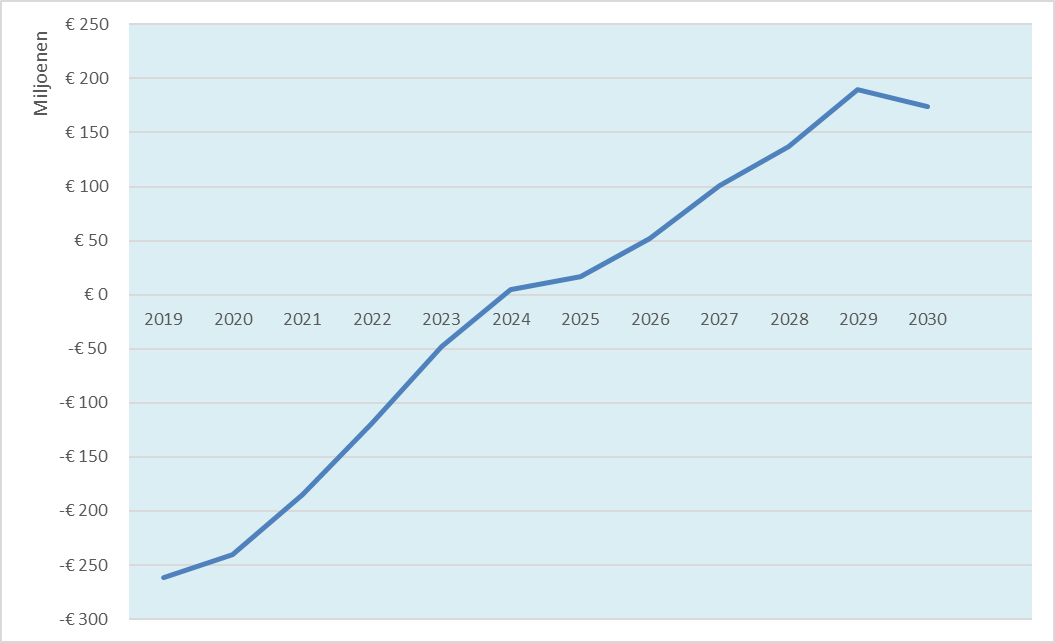 In 2019 is voor € 92 mln. aan opbrengsten gerealiseerd en zijn voor € 66 mln. kosten gemaakt. Hierdoor is de totale bruto boekwaarde met € 26 mln. gedaald van -€ 554 miljoen naar een bedrag van -€ 528 miljoen.