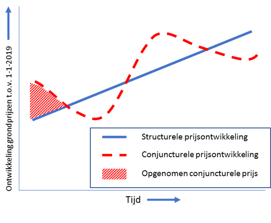 In onderstaande grafiek is schematisch weergegeven hoe de langjarige (gemiddelde) grondprijsontwikkeling en de conjuncturele prijsontwikkeling zich verhouden als gevolg van marktontwikkelingen. Op dit moment bevindt de markt zich naar verwachting op of rondom een conjuncturele piek. Het is niet reëel om dit huidige prijsniveau langjarig te verwachten en daarmee een te positief beeld te schetsen van de grondopbrengsten.