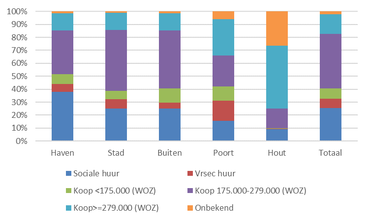 De totale woningvoorraad op 31-12-2019 bedraagt 85.977 woningen. Van alle woningen is 26% een sociale huurwoning en 7% een vrijesector huurwoning. Van alle koopwoningen heeft 8% een WOZ-waarde tot €175.000. Het middensegment betreft woningen tussen €175.000 en €279.000 en maakt 42% uit van de voorraad. Deze woningen zijn bereikbaar voor huishoudens met een jaarinkomen tot circa €57.000 (1,5x modaal). Het dure segment beslaat 15% van de totale voorraad. Meer dan de helft van de voorraad (57%) bestaat uit rij- of hoekwoningen. Een kwart van alle woningen zijn appartementen.