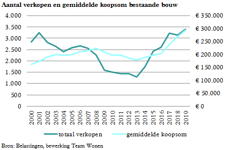 Aantal verkopen (tot 31-12- 2019, linker as) en gemiddelde koopsom bij koop (rechter as)