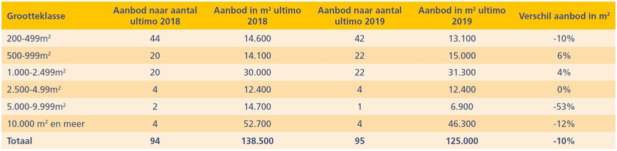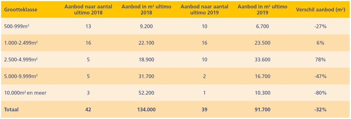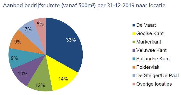 Het aanbod van bedrijfsruimte is in 2019 met ruim 30 % fors afgenomen tot 92.000 m2. De daling van het aanbod gebeurt al 4 jaar op rij. De bedrijfsruimtemarkt in Almere is krap geworden. Bijna de helft van het aanbod staat op de bedrijventerreinen De Vaart en Gooisekant.