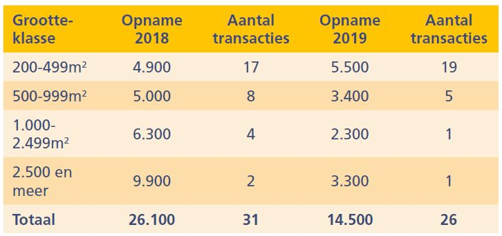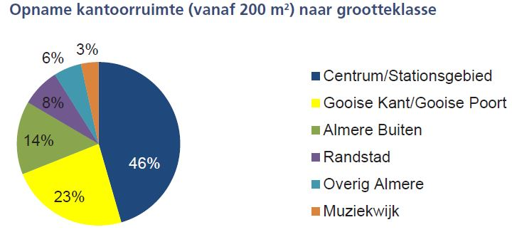 De opname op de kantorenmarkt was in 2019 14.500 m², verdeeld over 26 transacties. De opname van kantoorruimte in Almere blijft afhankelijk van incidentele omvangrijke transacties. De helft van deze opname is in Almere Centrum.