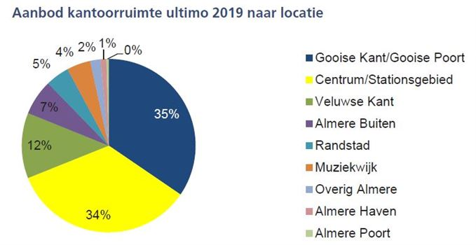 Sinds 2016 is het aanbod van kantoorruimte in Almere afgenomen. Ook in 2019 is dat het geval. Desalniettemin het totale aanbod relatief gezien nog steeds ruim. De kantorenmarkt is vooral lokaal en beperkt. Het aanbod (kantoorruimte op de markt aangeboden met en zonder gebruiker) is voor 70% te vinden in het zakencentrum bij station Almere Centrum en Poort/Gooisekant.