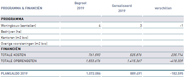 De begrote opbrengsten jaarschijf 2019 zijn niet gerealiseerd. Er is sprake van een afwijking van € 0,4 mln. nadelig ten opzichte van de begroting. De belangrijkste reden van het afwijken van de begroting is dat één kavel minder is verkocht dan begroot.