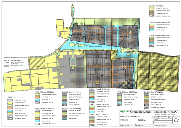 Het plangebied is circa 288,3 ha. groot. Hiervan is 191,1 ha. te handhaven (MVA delen). Het gebied in exploitatie is nu nog 97,2 ha., waarvan 55 ha. uitgeefbaar (57 %),14,7 ha. (27 %, grijs) nog uit te geven is en 40,3 ha. (73 %, geel) reeds is uitgegeven. Het overig deel á 42,2 ha. (43 %) is openbaar gebied. In de exploitatietekening is het plangebied weergegeven als exploitatiegrens van de grondexploitatie.