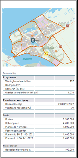 De kosten (€ 3,1 mln.) en opbrengsten (€4,6 mln.) hebben betrekking op de gemeentelijke grondexploitatie. Van de kosten en opbrengsten is reeds 7% gerealiseerd. De verwachting is dat het project in 2022 is afgerond.