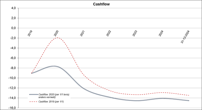 De onderstaande grafiek laat het verschil zien tussen de cashflow MPGA2020 en MPGA2019. Het verschil tussen de twee lijnen wordt in hoofdlijnen veroorzaakt door de volgende zaken: