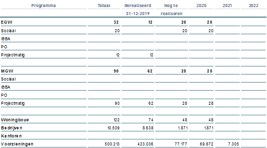 Bovenstaande tabel laat zien dat 60 % van het woningbouwprogramma, 82 % van het bedrijventerreinprogramma en 85 % van het voorzieningenprogramma reeds is gerealiseerd.