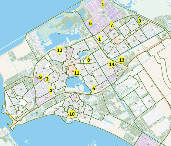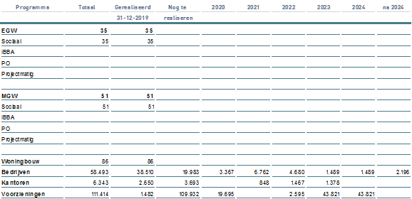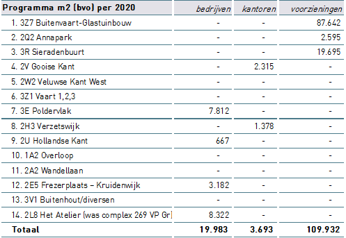 Bovenstaande tabel laat het gerealiseerde programma zien voor woningbouw (100%), bedrijven (66%), kantoren (42%) en voorzieningen (1%).