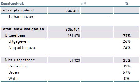 Van het totale exploitatiegebied van 23,5 ha. is circa 18,1 ha. uitgeefbaar (77%), circa 5,4 ha. is openbaar (23%). Inmiddels is uitgegeven circa 4,7 ha. (26 %). Totaal nog uit te geven oppervlak is circa 13,4 ha. (74%).