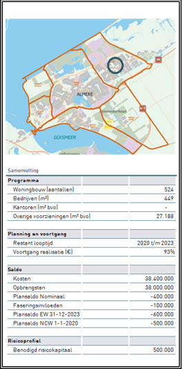 De kosten (€ 38,4 mln.) en opbrengsten (€ 38,0 mln.) hebben betrekking op de gemeentelijke grondexploitatie. Hiervan is reeds 93% gerealiseerd. De inzet is dat het project in 2023 wordt afgerond.