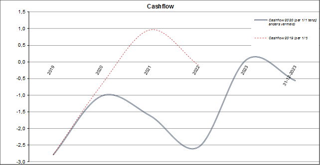 De onderstaande grafiek laat het verschil zien tussen de cashflow MPGA 2020 en MPGA 2019. Het verschil tussen de twee lijnen wordt in hoofdlijnen veroorzaakt door de volgende zaken:
