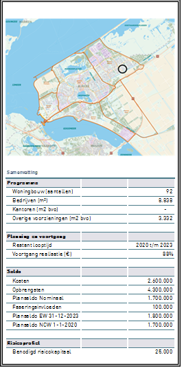 De kosten (€ 2,6 mln.) en opbrengsten (€ 4,3 mln.) hebben betrekking op de gemeentelijke grondexploitatie. Van de kosten en opbrengsten is reeds 88% gerealiseerd. De verwachting is dat het project in 2023 is afgerond.