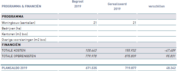 De begrote opbrengsten jaarschijf 2019 zijn gerealiseerd. Er is sprake van een afwijking van € 0,1 mln. voordelig ten opzichte van de begroting. De belangrijkste reden van het afwijken van de begroting zijn de grondverkopen met een hogere VON prijs.