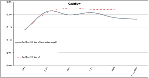 De onderstaande grafiek laat het verschil tussen de cashflow MPGA 2020 en MPGA 2019. Het verschil tussen de twee lijnen wordt in hoofdlijnen veroorzaakt door de volgende zaken:
