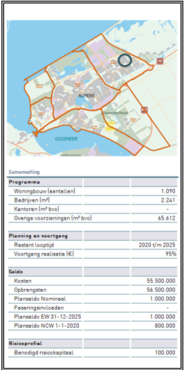De kosten (€ 55,5 mln.) en opbrengsten (€ 56,5 mln.) hebben betrekking op de gemeentelijke grondexploitatie. Van de kosten en opbrengsten is reeds 95% gerealiseerd. De verwachting is dat het project 2025 is afgerond.