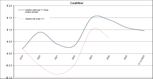 De onderstaande grafiek laat het verschil zien tussen de cashflow MPGA 2020 en MPGA 2019. Het verschil tussen de twee lijnen wordt in hoofdlijnen veroorzaakt door de volgende zaken: