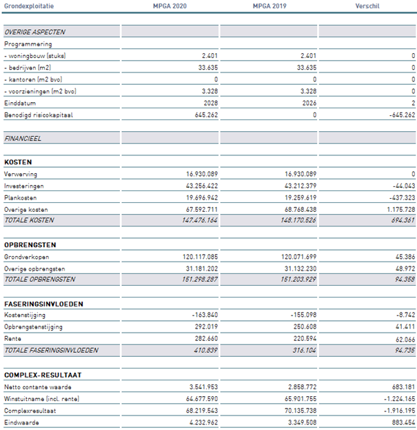 In dit hoofdstuk worden de belangrijke verschillen tussen de grondexploitatie MPGA 2020 en 2019 op hoofdlijnen toegelicht.