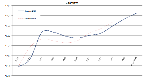 - In 2019 heeft een terugstorting van € 1,2 mln. van de reeds genomen winstuitneming plaatsgevonden. Dit heeft een positief effect op de boekwaarde per 1-1-2020. Deze ligt hoger dan de cashflowlijn 2019 aangeeft. Dit effect is ook zichtbaar in de piek in 2021 van de cashflowlijn 2020 en in de eindwaarde in 31-12-2028 versus de eindwaarde in 31-12-2026