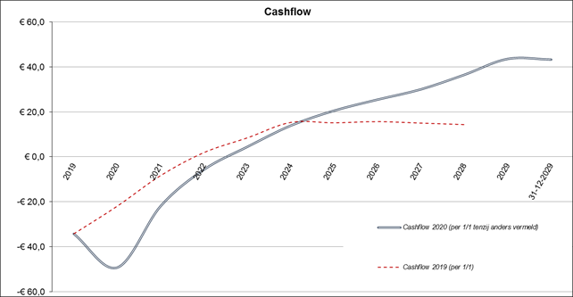 - De cashflow komt in 2020 lager vanwege de activering van de MVA-gronden. Hierdoor is historische boekwaarde toegevoegd aan de grondexploitatie. Daarnaast is de begroting 2019 niet gehaald wat ook een kleiner negatief effect heeft op de cashflow per 1-1-2020.