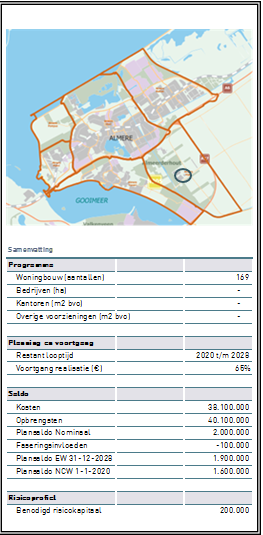 De kosten (€ 38,1 mln.) en opbrengsten (€ 40,1 mln.) hebben betrekking op de gemeentelijke grondexploitatie. Van de kosten en opbrengsten is reeds 65% gerealiseerd. De verwachting is dat het project 2028 is afgerond.