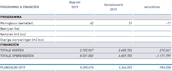 De begrote opbrengsten j aarschijf 2019 zijn niet gerealiseerd. Er is sprake van een afwijking van € 1,2 mln. nadeel ten opzichte van de begroting. De belangrijkste reden van het afwijken van de begroting is het niet behalen van de voorgenomen verwachte grondverkopen.
