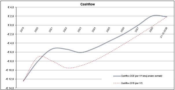 De onderstaande grafiek laat het verschil tussen de cashflow MPGA 2020 en MPGA 2019. Het verschil tussen de twee lijnen wordt in hoofdlijnen veroorzaakt door de volgende zaken: