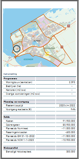 De kosten (€ 91,9 mln.) en opbrengsten (€ 80,9 mln.) hebben betrekking op de gemeentelijke grondexploitatie. Van de kosten en opbrengsten is reeds 94% gerealiseerd. De verwachting is dat het project in 2022 is afgerond.