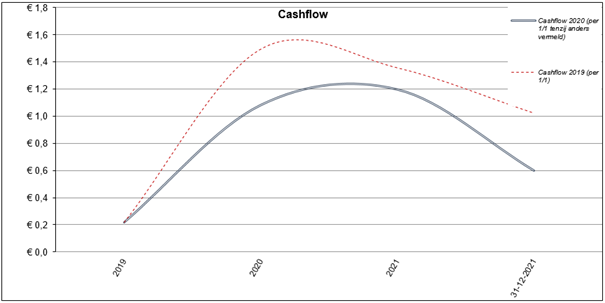 De onderstaande grafiek laat het verschil tussen de cashflow MPGA 2020 en MPGA 2019. Het verschil tussen de twee lijnen wordt in hoofdlijnen veroorzaakt door de volgende zaken: