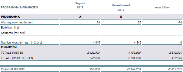 Dit onderdeel van de grondexploitatietoelichting heeft een relatie met de Jaarrekening 2019. Op hoofdlijnen wordt toegelicht of het begrote programma, kosten en opbrengsten zijn gerealiseerd. In onderstaande tabel is de begroting 2019 vergeleken met de realisatie over het jaar 2019.