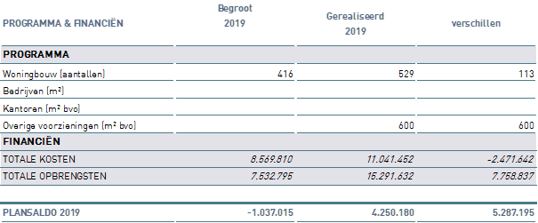 Er zijn meer opbrengsten gerealiseerd dan begroot in jaarschijf 2019. Er is sprake van een afwijking van € 7,8 mln. positief ten opzichte van de begroting. De belangrijkste redenen zijn een versnelling van gronduitgiftes in het deelplan OKW en een ontvangen nabetaling over in 2018 verkochte grond, eveneens in OKW. Daarnaast zijn er reserveringsvergoedingen ontvangen en is een begrote btw-afdracht doorgeschoven in de fasering.