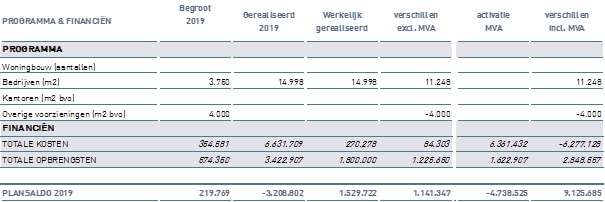 Als gevolg van de bovenstaande effecten (incl. de activering van de MVA-gronden met een boekwaarde van € 4,7 mln.) is er een afwijking van € 3,2 mln. nadelig op het plansaldo (zie kolom gerealiseerd 2019).