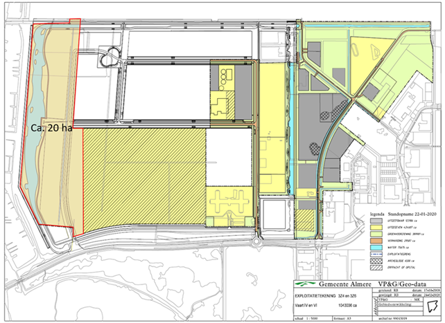De plankaart van actieve exploitatie betreft de uitgeefbare kavels met een bruto planoppervlak van circa 104 ha. Hiervan is 55 ha. uitgeefbaar en 50 ha. openbaar. Een deel van de beschikbare grond op De Vaart 4 (52 ha) is opgenomen in de MVA (wit).